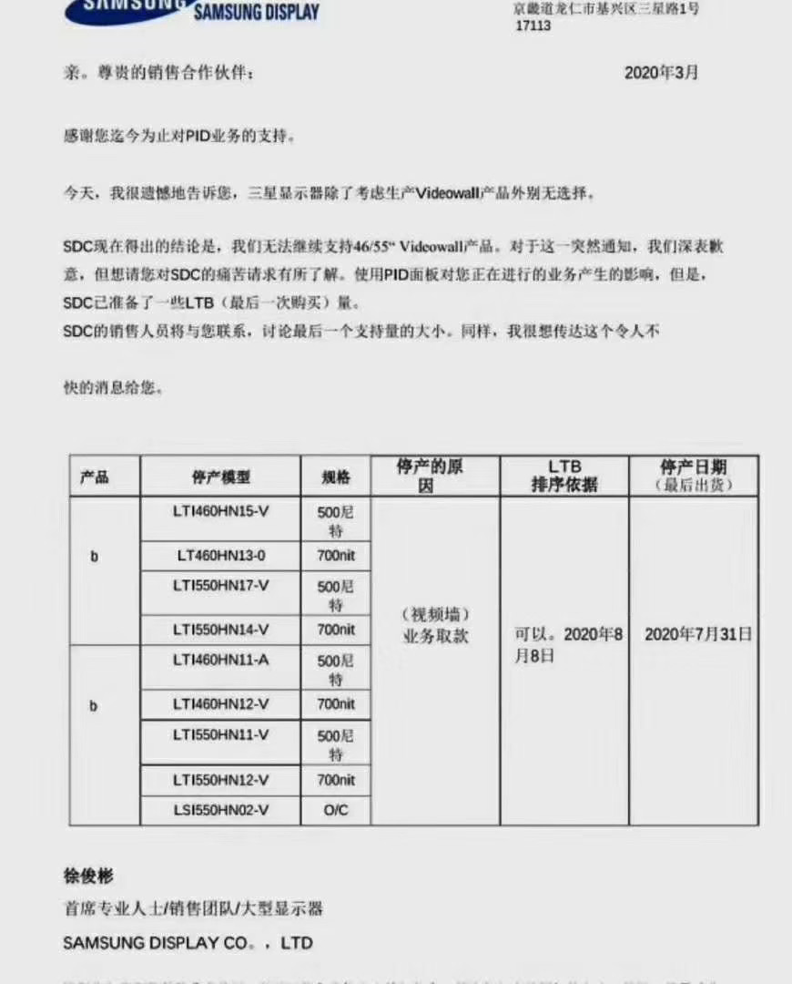 很榮幸能跟貴司在拼接屏領(lǐng)域保持多年的良好合作.在貴司的鼎立支持下,我們?cè)谄唇邮袌?chǎng)長(zhǎng)期保持市場(chǎng)領(lǐng)先地位。由于SDC總公司對(duì)顯示業(yè)務(wù)的整體戰(zhàn)略調(diào)整,未來(lái)SDC會(huì)將現(xiàn)有的拼接屏產(chǎn)線轉(zhuǎn)換為QD-Display產(chǎn)線。所以我司將無(wú)法再持續(xù)當(dāng)前拼接屏業(yè)務(wù),這里很遺憾的提前通知貴司,我司將會(huì)正式下線所有拼接屏產(chǎn)品!非常抱歉在這樣的一個(gè)疫情特殊時(shí)期沒辦法當(dāng)面通知貴司,也請(qǐng)理解我司這個(gè)痛苦和艱難的決定!