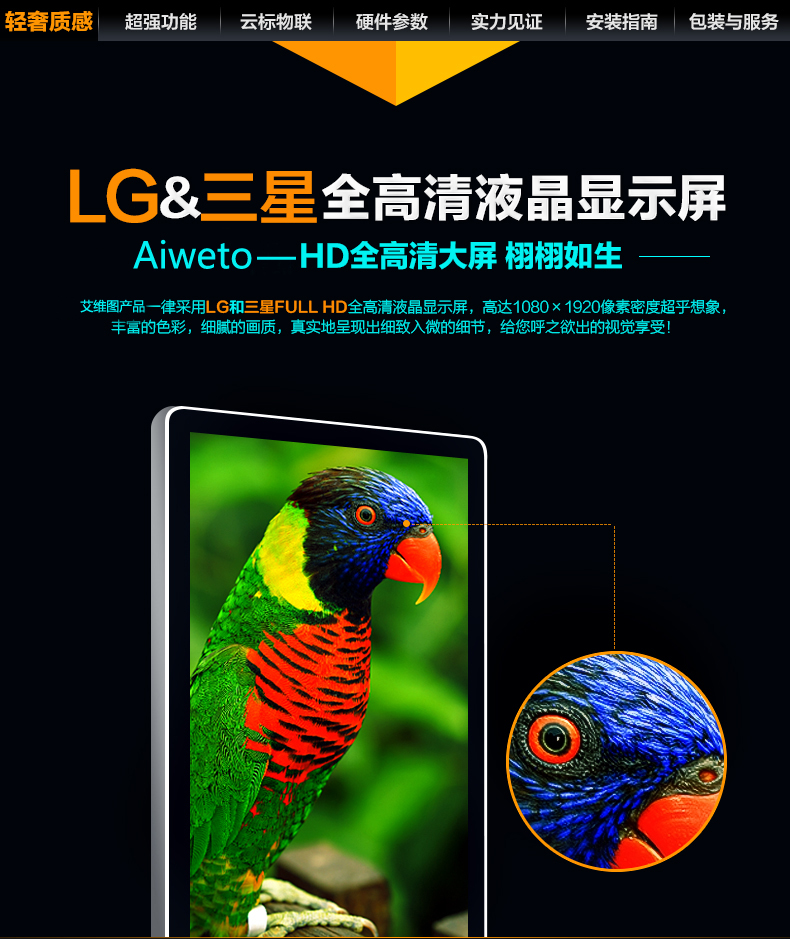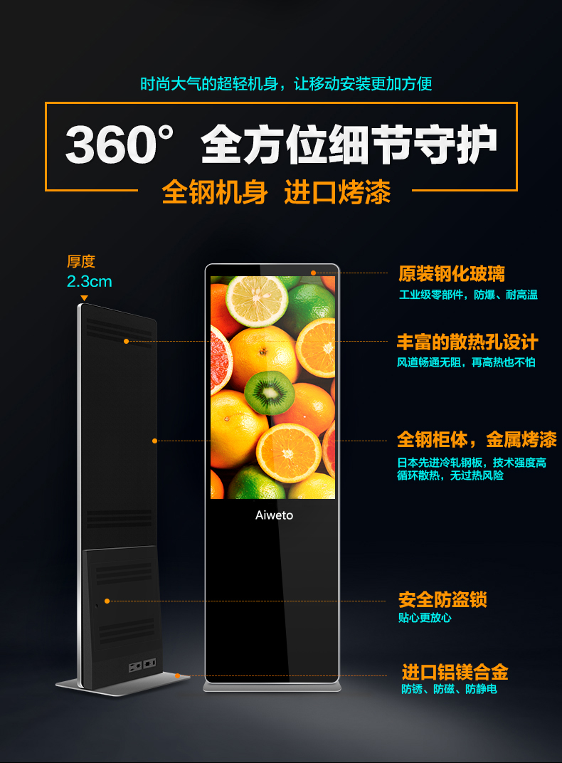 AW-CM650L01 立式觸摸一體機采用全高清(1920*1080)液晶面板,具有178度視角,高對比度和亮度,3D數字降噪,智能消除殘影、重影等失真現象,使得顯示畫面更清晰,穩定,色彩更鮮艷。可廣泛運用于快餐店、訂票處、學校、機場、酒店大堂、交易所、電影院、企業、會展展館、商場等場所。