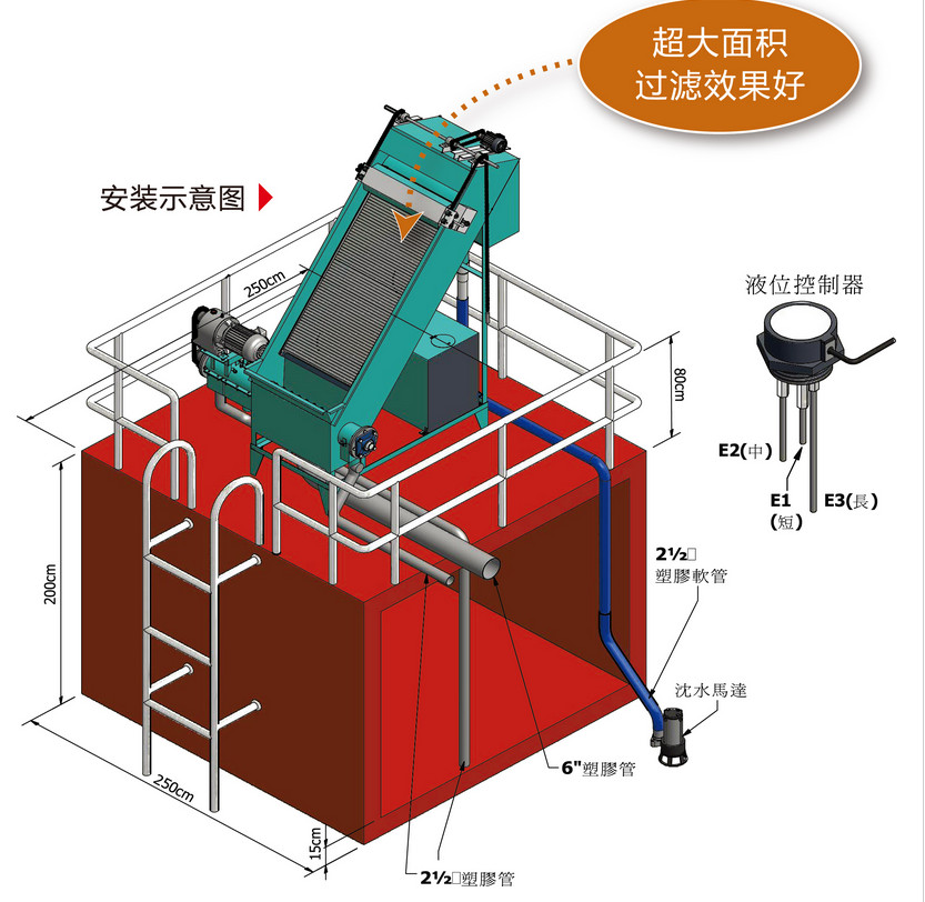 斜篩式干濕分離器主體為由楔形鋼棒經制成的不銹鋼平面過濾篩面,待處理廢水通過溢流堰均勻分布到傾斜篩面上,由于篩網表面間隙小、平滑,背面間隙大,排水順暢,不易阻塞,固態物質被截留,過濾后的水從篩板縫隙中流出,同時在水力作用下,固態物質被推到篩板下端排出,從而達到固液分離目的。