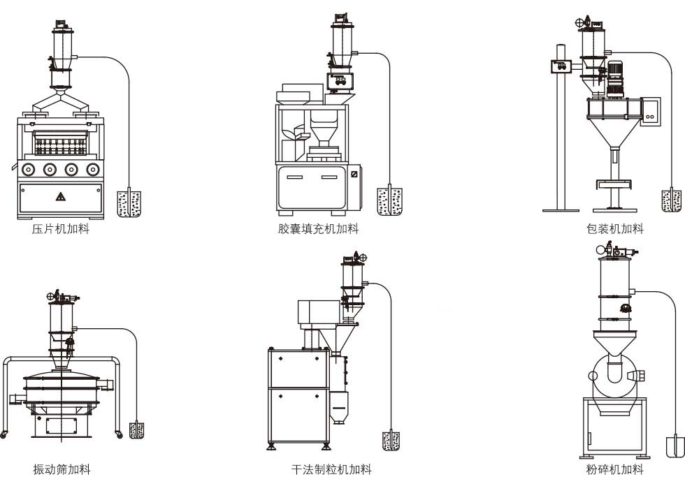 真空上料機(jī)是利用真空發(fā)生器作為真空源的一種真空輸送機(jī),利用該真空加料機(jī)可以將物料從容器中直接送入混合機(jī)、反應(yīng)器、料斗、壓片機(jī)、包裝機(jī)、振動篩、整粒機(jī)、濕法制粒機(jī)、干法制粒機(jī)和粉碎機(jī)中去。該機(jī)減輕了工人的勞動強(qiáng)度,杜*了粉塵污染,保證生產(chǎn)符合“GMP”要求。